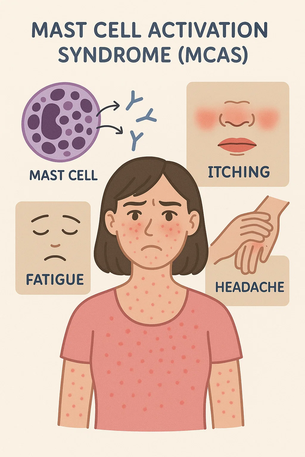 - MCAS, aşırı mast hücre mediatör salınımı ile karakterize, inflamatuar ve alerjik semptomlara yol açan bir multisistem bozukluğudur. Mastositozdan (mast hücrelerinin çoğalması) farklıdır ve genetik test (örn. KIT mutasyonu) veya mastositoz için kemik iliği biyopsisi yoluyla farklılaşma gerektirir.