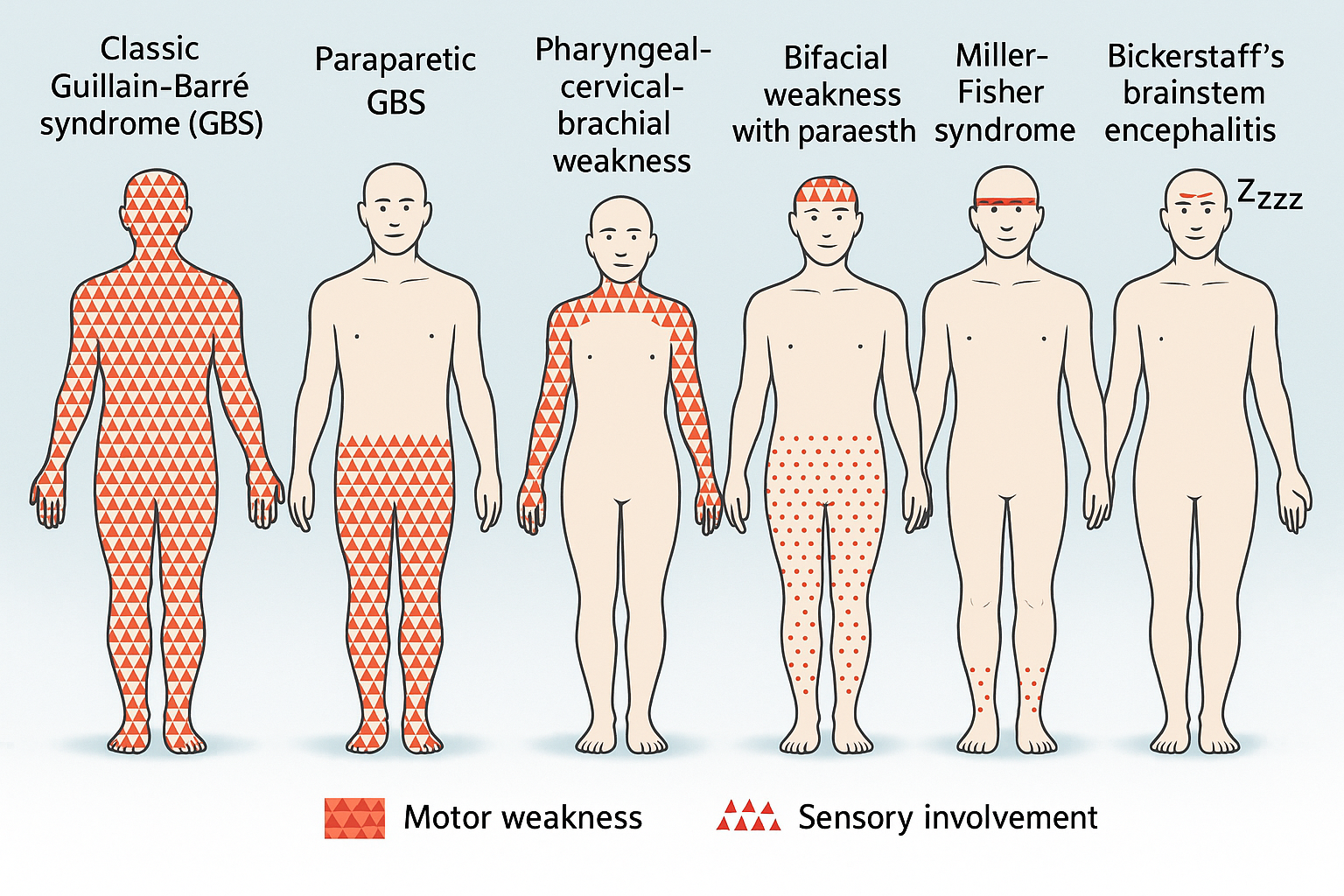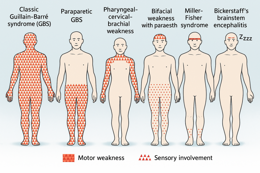 - Klasik GBS: Ekstremite zayıflığı daha belirgindir, oftalmopleji nadirdir
