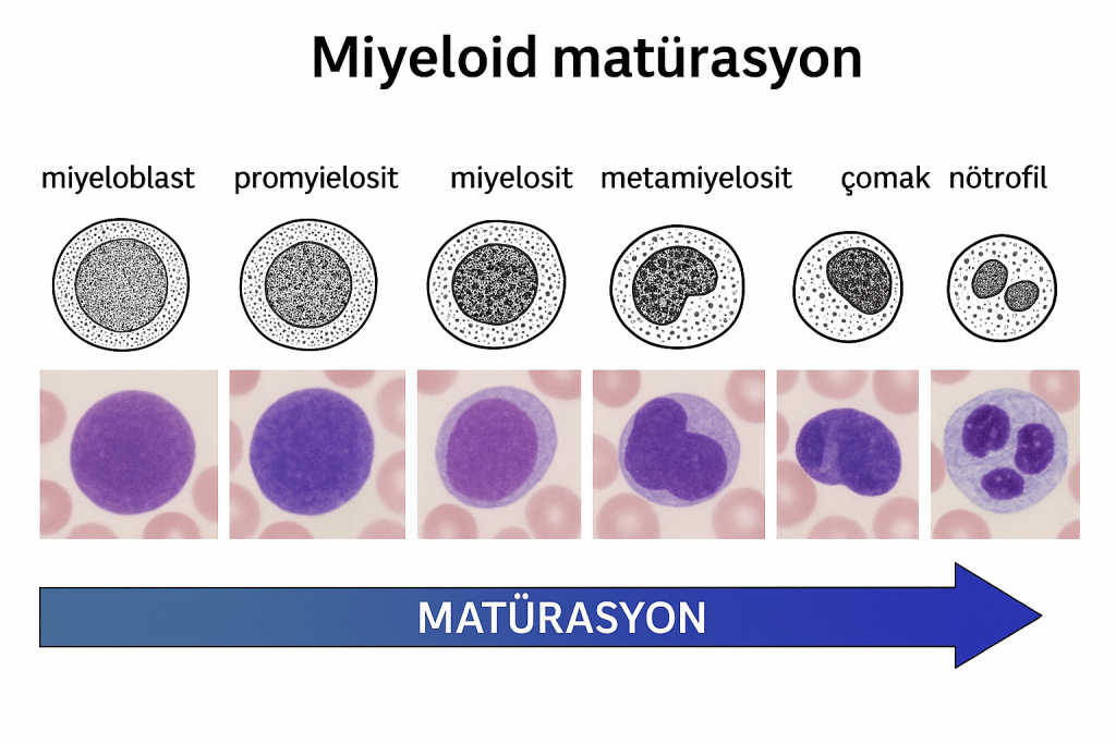 - Periferik kanda miyelosit görülmesi, genellikle ağır enfeksiyon, kemik iliği hastalıkları (örn. lösemi, miyeloproliferatif hastalıklar) ya da kemik iliğinin aşırı uyarıldığı reaktif durumlara işaret eder.