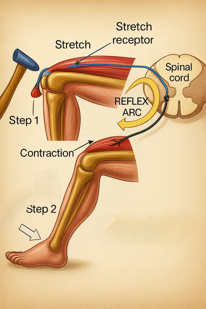 - Tanı Aracı: Omurilik bütünlüğünü ve nörolojik sağlığı değerlendirmek için refleks yaylarını (örn. diz refleksi) test eder. Anormal tepkiler (yok/abartılı) sinir hasarına veya MSS bozukluklarına işaret edebilir.
