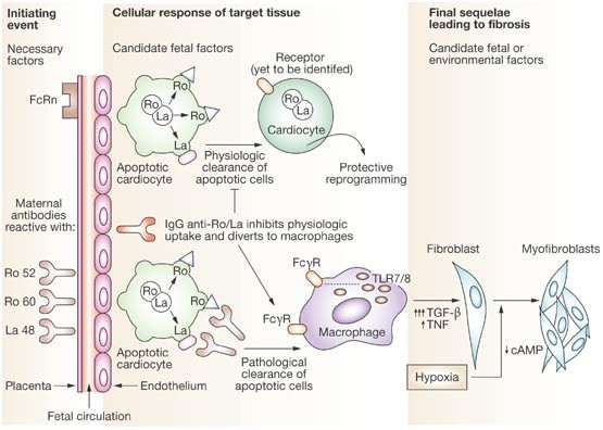 Eğer Annede SSA(Ro), SSB(La) Antikorları mevcutsa, %5 ihtimalle plezanta üzerinden bebeğe geçerek hastalığa sebep olurlar. Olasılık hamileleik sayısıyla doğru orantılıdır. Hastalığa maruz kalan bebeklerin %10’u konjenital AV-Blok sorunuyla karşı karşıya kalır. Sebebi ise; plazenta yoluyla alınan antikorların Kariyomiyozitlere bağlanarak bağışıklık reaksiyonu oluşturmaları, takiben oluşan Miyokardit ve AV düğümündeki fibrozlaşmadan ötürü elektriksel aktivete sekme yaşanmasıdır.