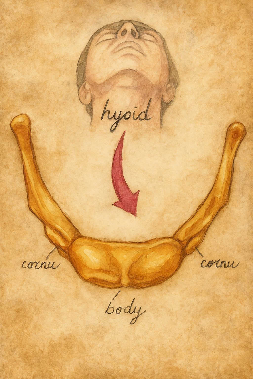 Os hyoideum’un hikâyesi, antik metinlerdeki ilk silik işaretlerden başlayıp modern morfometriye, sonlu eleman analizlerine ve uyku apnesi cerrahisine kadar uzanan, dil-farinks-larenks üçlüsünün tam ortasında salınan küçük bir “askı” kemiğin uzun serüvenidir. Boynun derinliğinde at nalını andıran bu kemik, hiçbir başka kemikle eklem yapmayan tuhaf konumu sayesinde, tarih boyunca hem anatominin adlandırma düzenlerini hem de konuşmanın evrimini tartıştırmıştır. Aşağıdaki anlatı, izleri sürülebilen başlıca dönemeçleri ardı ardına getirerek bu serüveni kronolojik bir örgü içinde birleştirir.