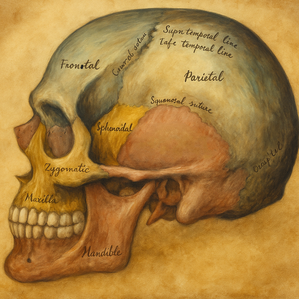 - Margo frontalis-parietalis: Frontal ve paryetal kemiklerle sutural teması sağlar; sfenoid-paryetal ve sfenoid-frontal sütürler pterional bölgede cerrahi referans noktalarıdır.