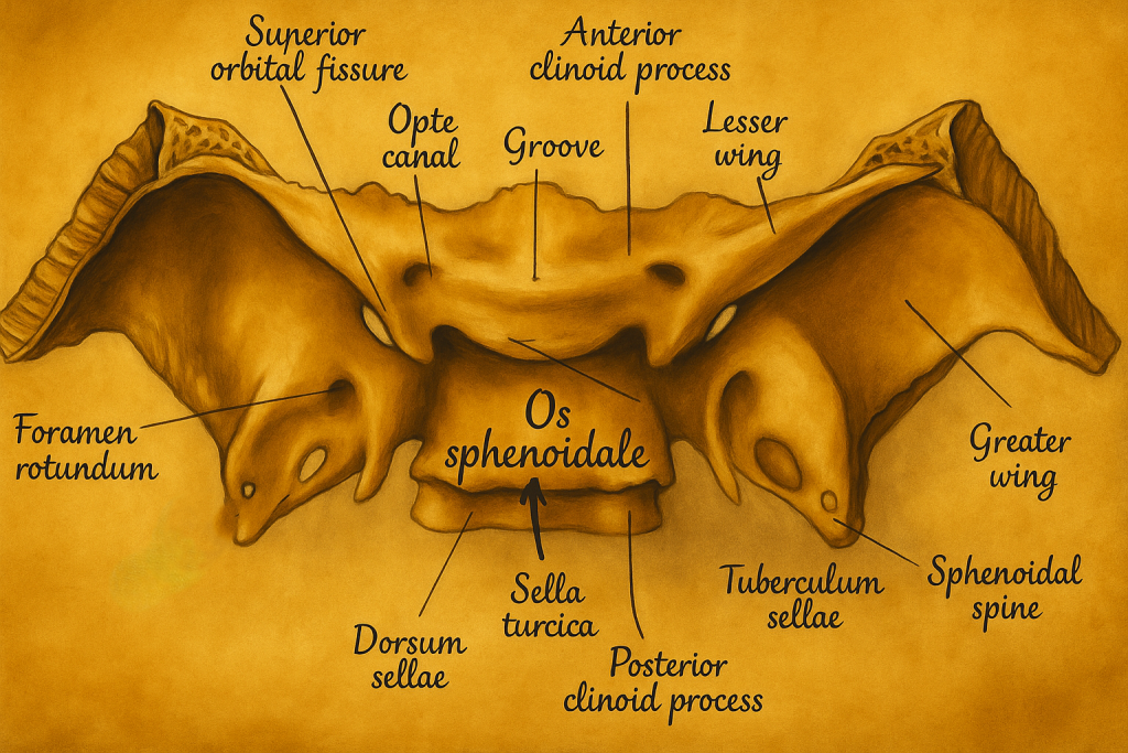 Sfenoid, merkezî konumu nedeniyle tarih boyunca “ruhun tahtı”, “üçüncü gözün kapısı” gibi metaforlarla çevrelenmiştir. Descartes’ın ruh-beden etkileşimini pineal beze atfeden meşhur tezi bile, halk inancında zaman zaman “sfenoidin içindeki gizli merkez” olarak yeniden anlatılmıştır. Bu imgeler kültür tarihinin parçasıdır; ancak modern anatomi ve sinirbilim açısından sfenoidin rolü, bir iskeletsel geçitler ve sınırlar mimarisi kurmak, sinir ve damar yollarına koridorlar sağlamak ve kafa tabanının yüklenmesini düzenlemektir. “Kelebek kemiği” benzetmesi, bugün de öğrencilerin zihninde sfenoidin şekline dair bir anımsatıcı olarak yaşasa da, klinikte belirleyici olan kanatlar, kretler, foramenler ve komşulukların soğukkanlı haritasıdır.