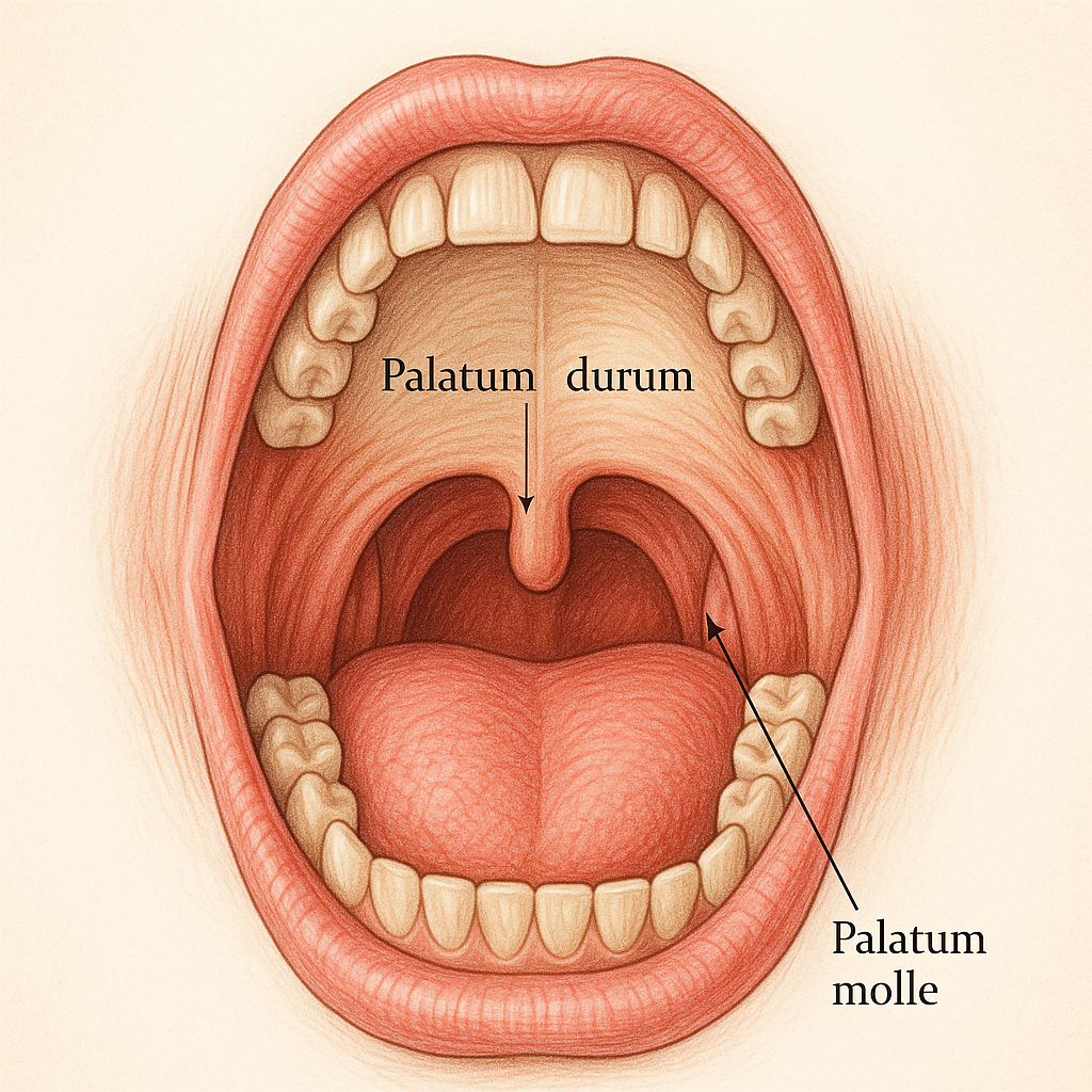 - Palatum molle: Yumuşak damak; kas ve mukozal dokudan oluşur, uvulayı da içerir.