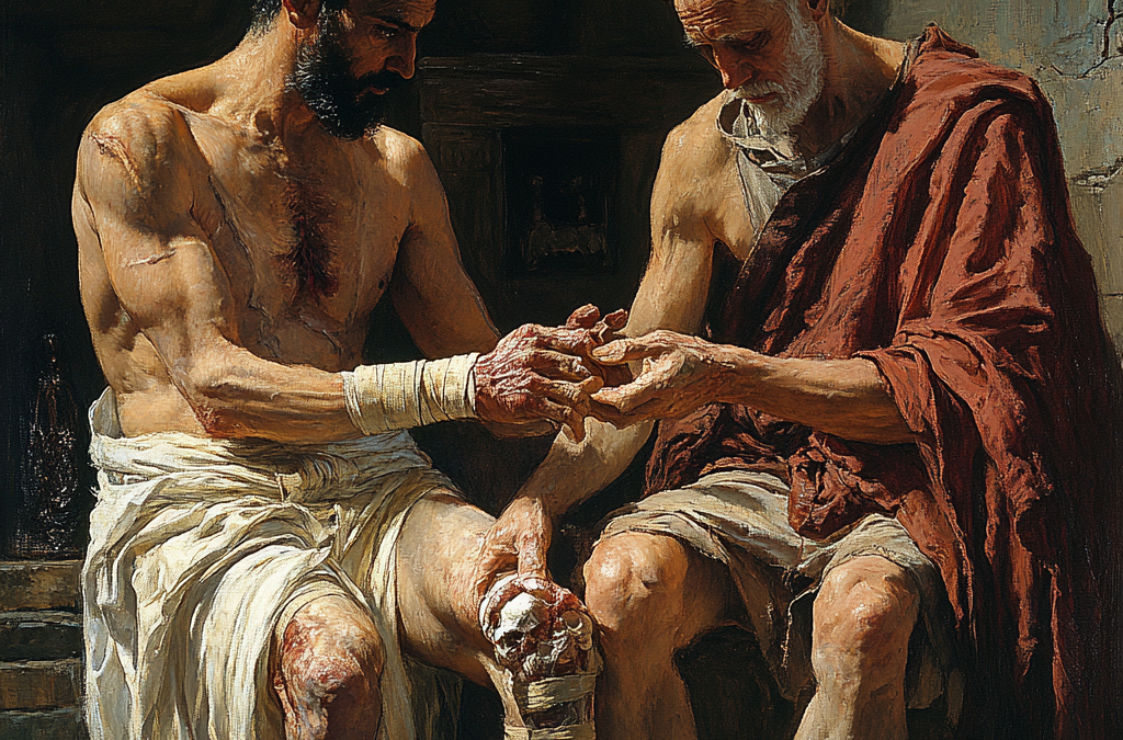 Döneme ait canlı bir anlatı, Olympia’da yaralı bir sporcuyla ilgilenen bir hekimden bahseder. Özenle oyulmuş ahşap destekleri kullanarak kırık bacağı sabitlemiş ve bu eylemi “vücudu doğal formuna geri döndürmek” olarak tanımlamıştır. Bu pratik πήγνυμι uygulaması, Yunan düşüncesindeki daha geniş anlamını yansıtıyordu: istikrar yoluyla düzenin restorasyonu.