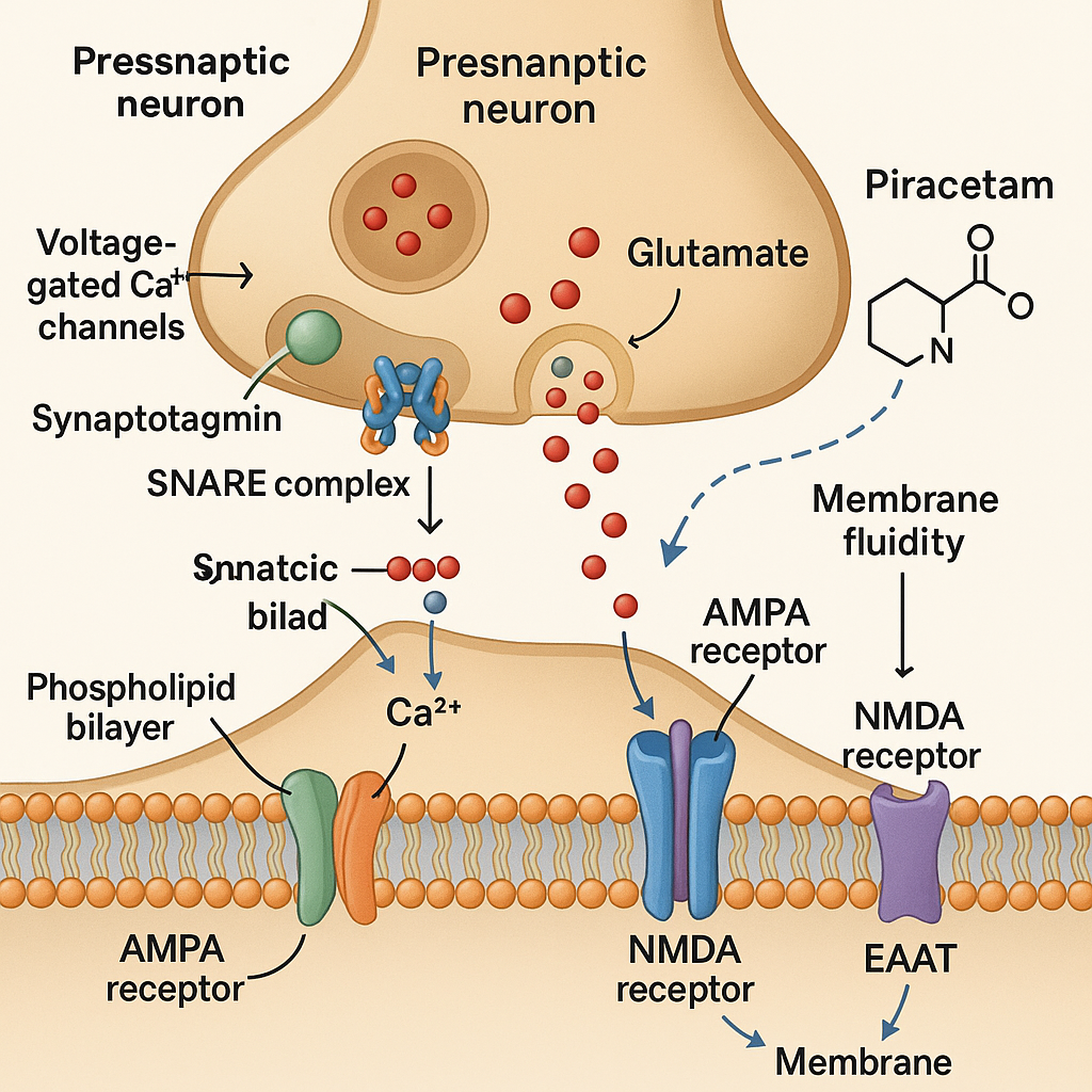 - Hücre zarı akışkanlığının modülasyonu: Pirasetam hücre zarlarının lipid kompozisyonunu etkileyerek akışkanlığın artmasına neden olur. Bu, membran reseptörlerinin işlevini iyileştirebilir ve böylece sinaptik iletimi ve nöronal plastisiteyi olumlu yönde etkileyebilir.
