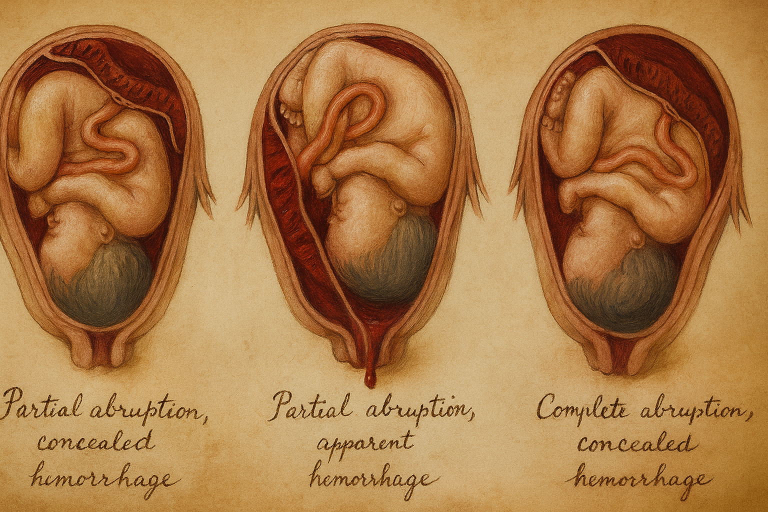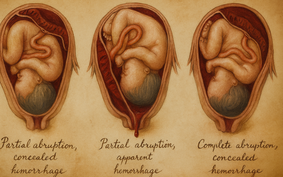 - Gizli (concealed) abruption: Kan uterus içinde birikir; dış kanama az olabilir ancak hemodinamik kayıp ve fetal tehlike ağırdır.