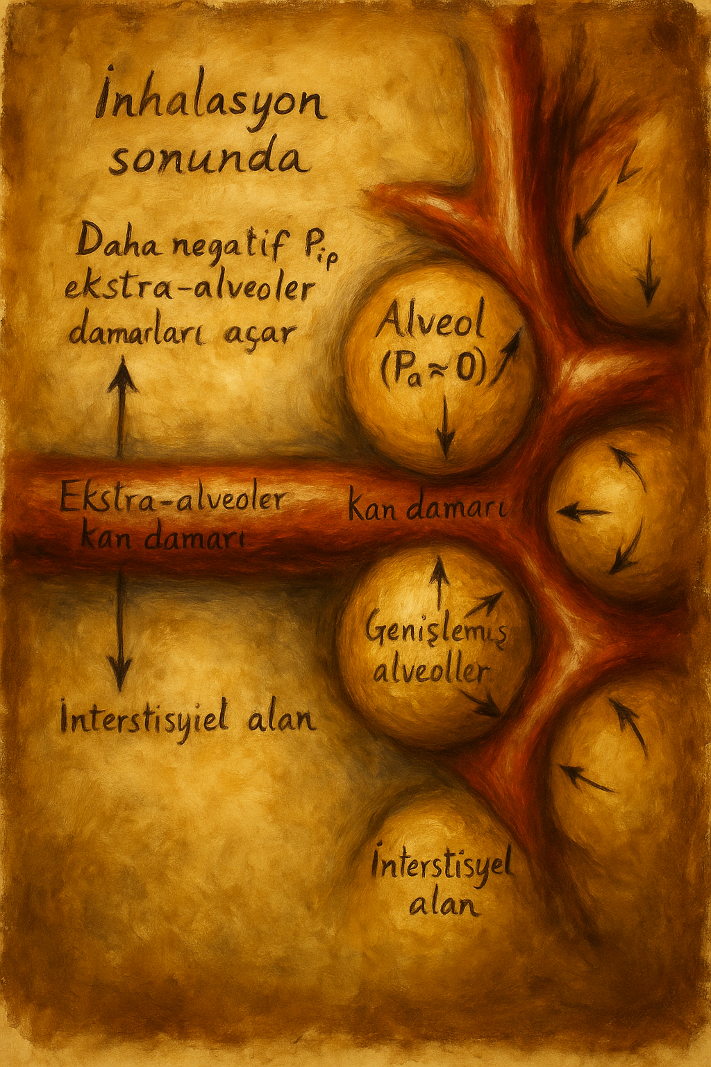- Düşük akciğer hacmi (atelectazi, ekspiryum sonu altı): Ekstra-alveoler damarlar çevresel çekişin azalmasıyla daralır → PVR artar.