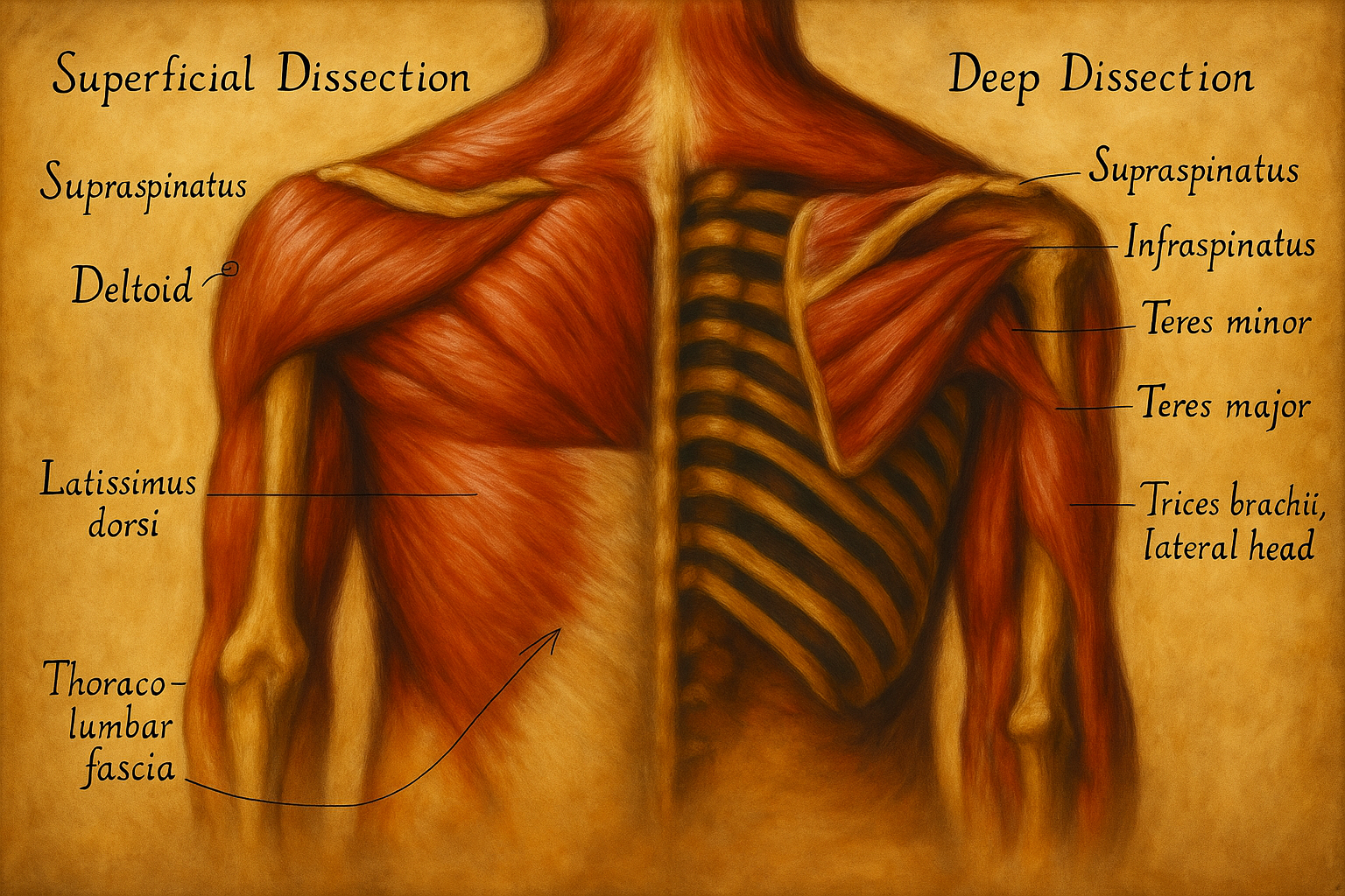 Açı anatomisiyle başlar: omuz kuşağının “döndürücü” kas-tendon manşeti (supraspinatus, infraspinatus, teres minor, subscapularis) fikri, Rönesans anatomi atlaslarının kasları ayrı ayrı tarif etmesiyle filizlenir. Vesalius’un 1543’te lif yönlerini ve skapulanın kretlerini gösteren bakır gravürleri, omuzda çok eksenli hareketi mümkün kılan bir “kas çemberi” izlenimini ilk kez açık biçimde verir. Ardından Falloppio ve Eustachius, skapulanın çukurları ile humerusun büyük-küçük tüberkülleri arasındaki tendon geçişlerini ayrıntılandırır; Paré, klinik metinlerinde omuz çevresi zedelenmelerin uzamış ağrı ve işlev kaybına yol açtığını –bugün rotator manşet ağrısı dediğimiz– bir sendrom olarak betimler. Henüz “manşet” kavramı yoktur; fakat kemik çevresine sarılmış, lif yönleri birbirini tamamlayan kasların birlikte çalıştığı fikri yerleşir.