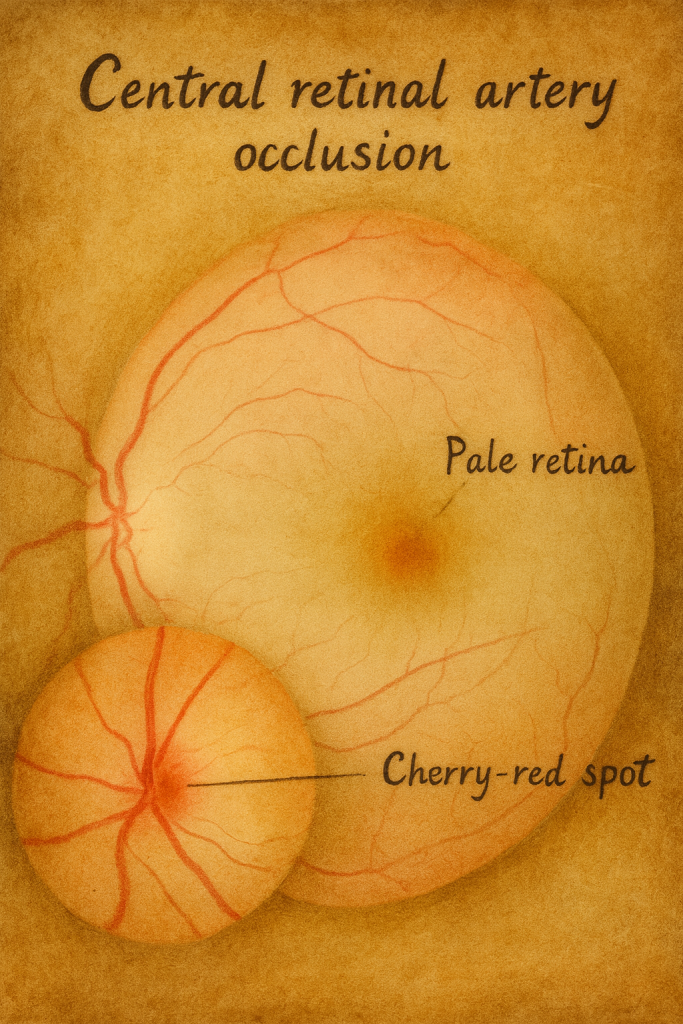 - Oftalmik arter tıkanıklığı: Daha ağır iskemik tablo; koroidal perfüzyon da bozulur, kiraz kırmızısı nokta kaybolabilir.