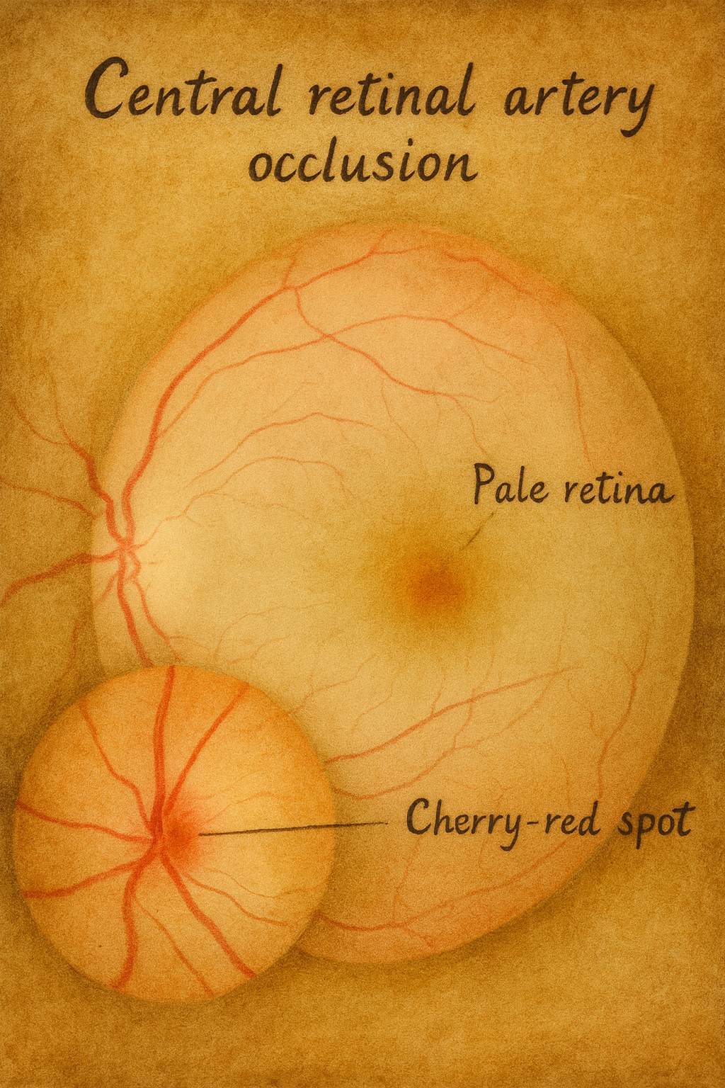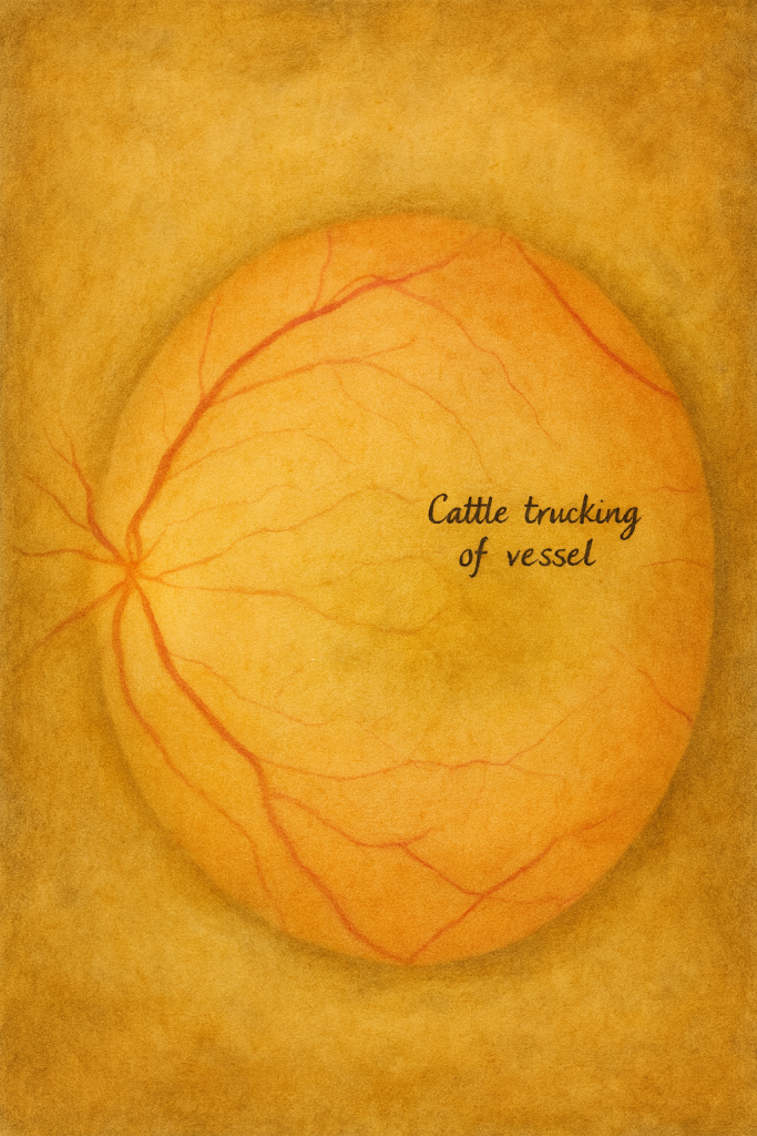 - Fundus: Soluk-opasifiye retina (iç retinal ödem), kiraz kırmızısı fovea, arteriyollerde “box-carring” (kolonlaşmış kan sütunları), venlerde dolum gecikmesi.