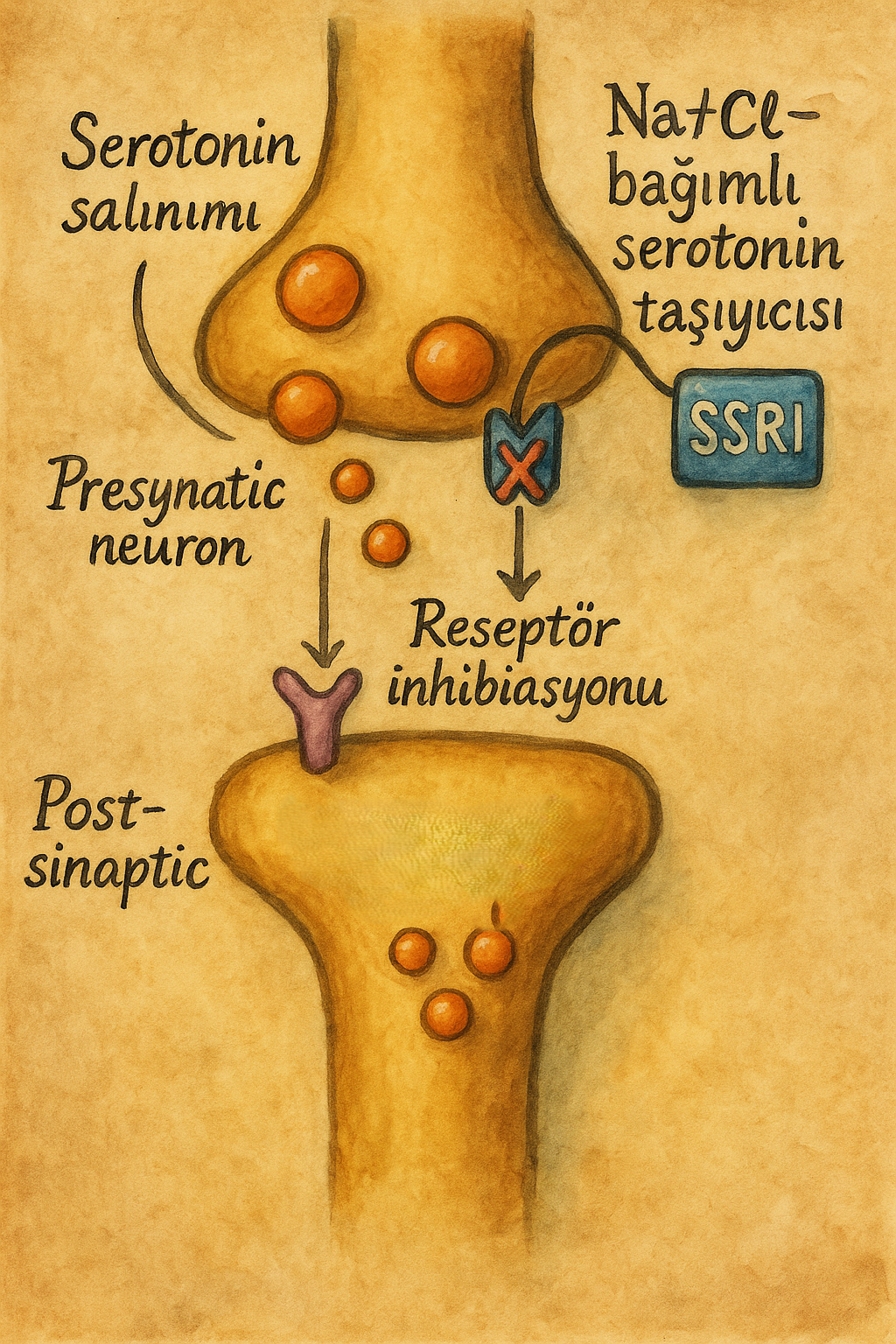 SSRI’lar, presinaptik nöron membranında yer alan serotonin taşıyıcısına (SERT) yüksek afiniteli ve görece selektif olarak bağlanır. Bu bağlanma, serotoninin presinaptik hücreye geri alınmasını inhibe eder ve şu sonuçları doğurur: