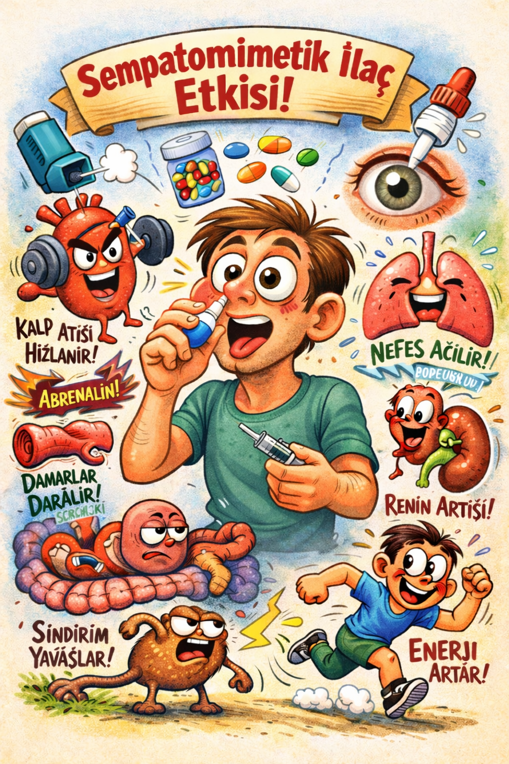 Sempatomimetikler, otonom sinir sisteminin sempatik kolunun fizyolojik etkilerini taklit eden ya da bu etkileri güçlendiren farmakolojik ajanlardır. Klinik pratikte çok geniş bir yelpazede karşımıza çıkarlar: tablet, kapsül, granül, inhalasyon formları, enjeksiyon çözeltileri, göz damlaları ve burun spreyleri gibi farklı dozaj şekilleriyle uygulanabilirler. Bu çeşitlilik, sempatomimetiklerin hem hedef doku çeşitliliğini hem de farklı zaman ölçeklerinde (dakikalar–saatler) kullanılabilmesini yansıtır.