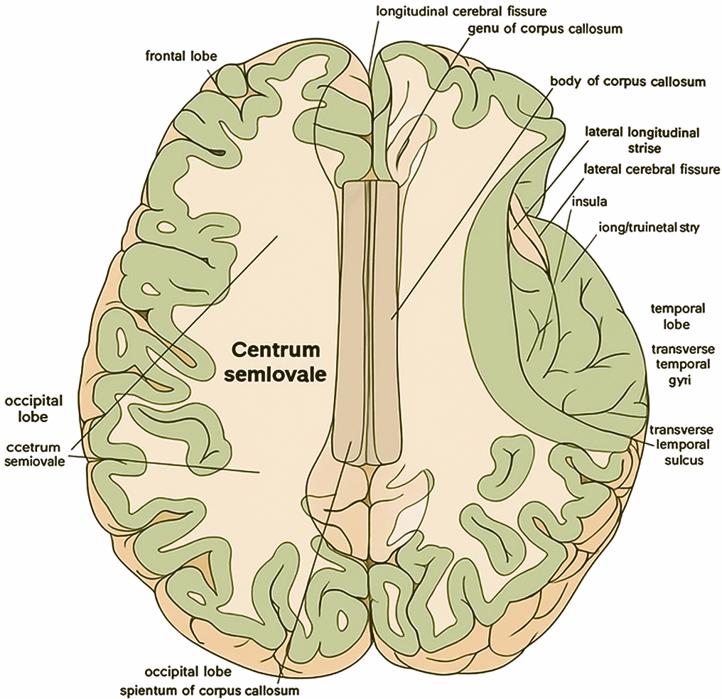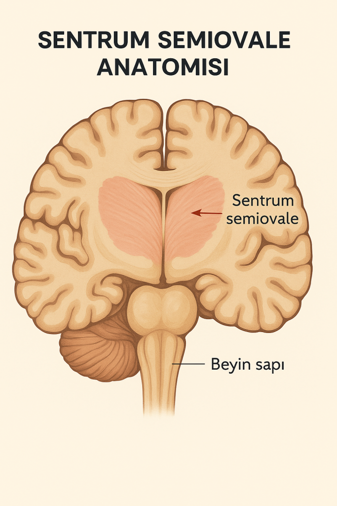 Centrum semiovale serebral hemisferlerin üst bölgesinde bulunan beyaz cevher yapılarından biridir ve frontal, parietal ve oksipital lobların derinliklerinde yer alır. Anatomik konumu aşağıdaki referanslarla açıklanabilir: