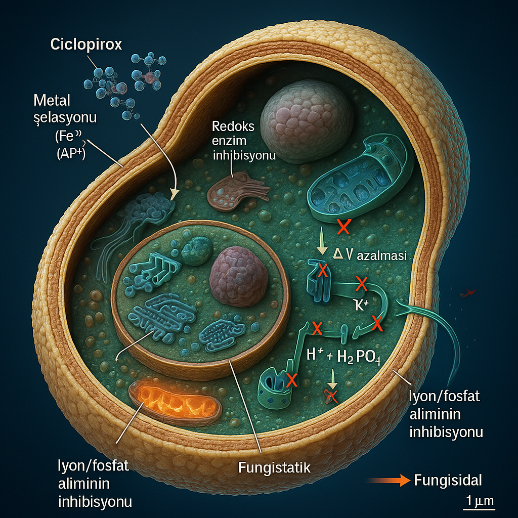 Ciclopirox, başta Fe³⁺ olmak üzere kritik metal iyonlarını şelate ederek mantar hücresinin metal-bağımlı enzimlerini inaktive eder; bunun sonucunda enerji metabolizması, oksidatif stres yanıtı ve makromolekül sentezi aksar. Bu süreç, membran permeabilitesinin ve iyon/besin alımının (özellikle K⁺ homeostazı ve fosfat taşınımı) bozulmasına kadar uzanır. İlaveten, spor çimlenmesi ve biyofilm oluşumu baskılanır; topikal düzeyde antiinflamatuvar etkiler klinik semptomları hafifletir. Bu birleşik etkiler, saccharomycetler ve dermatofitler dahil geniş bir mantar yelpazesinde büyümenin durdurulması ve uygun koşullarda ölümüne yol açar.