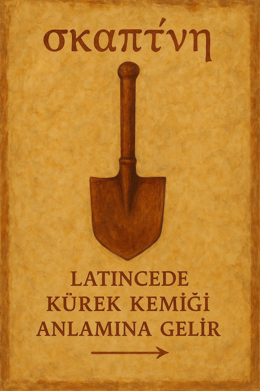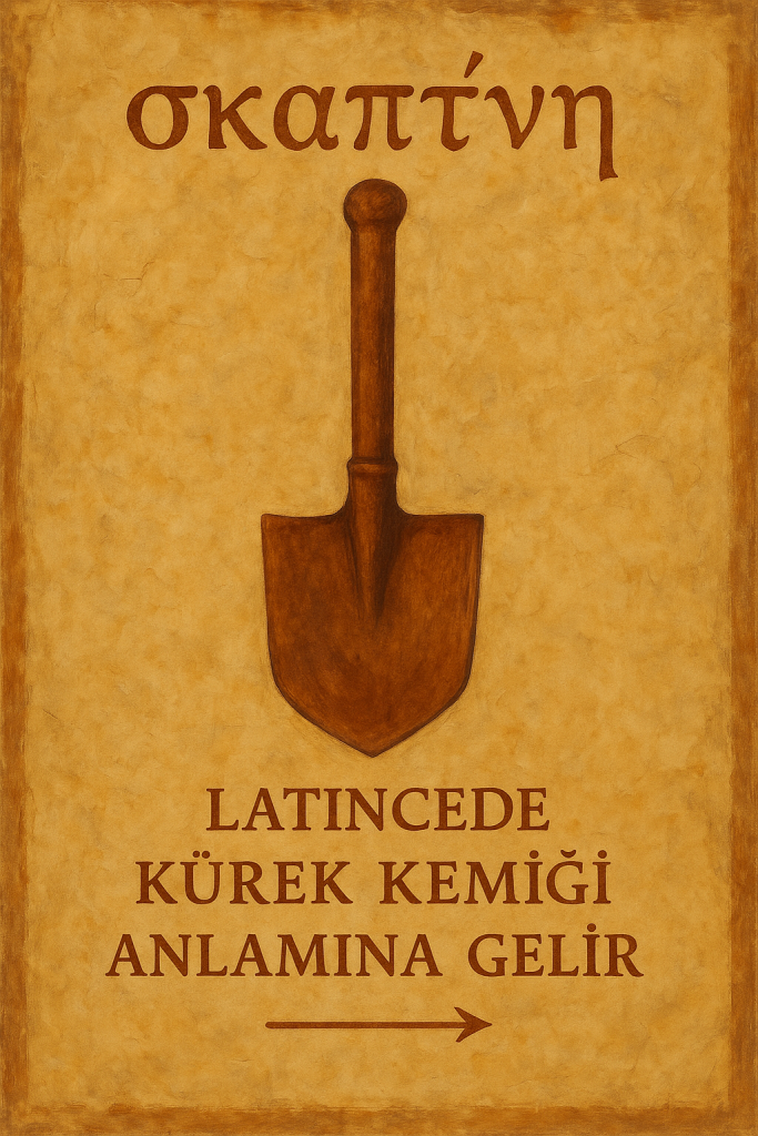 Antik Yunancada σκαπάνη (skapánē, “kürek, kazma”), σκάπτω (skáptō, “kazmak, arayıp taramak”) → Latincede kürek kemiği anlamına gelir.