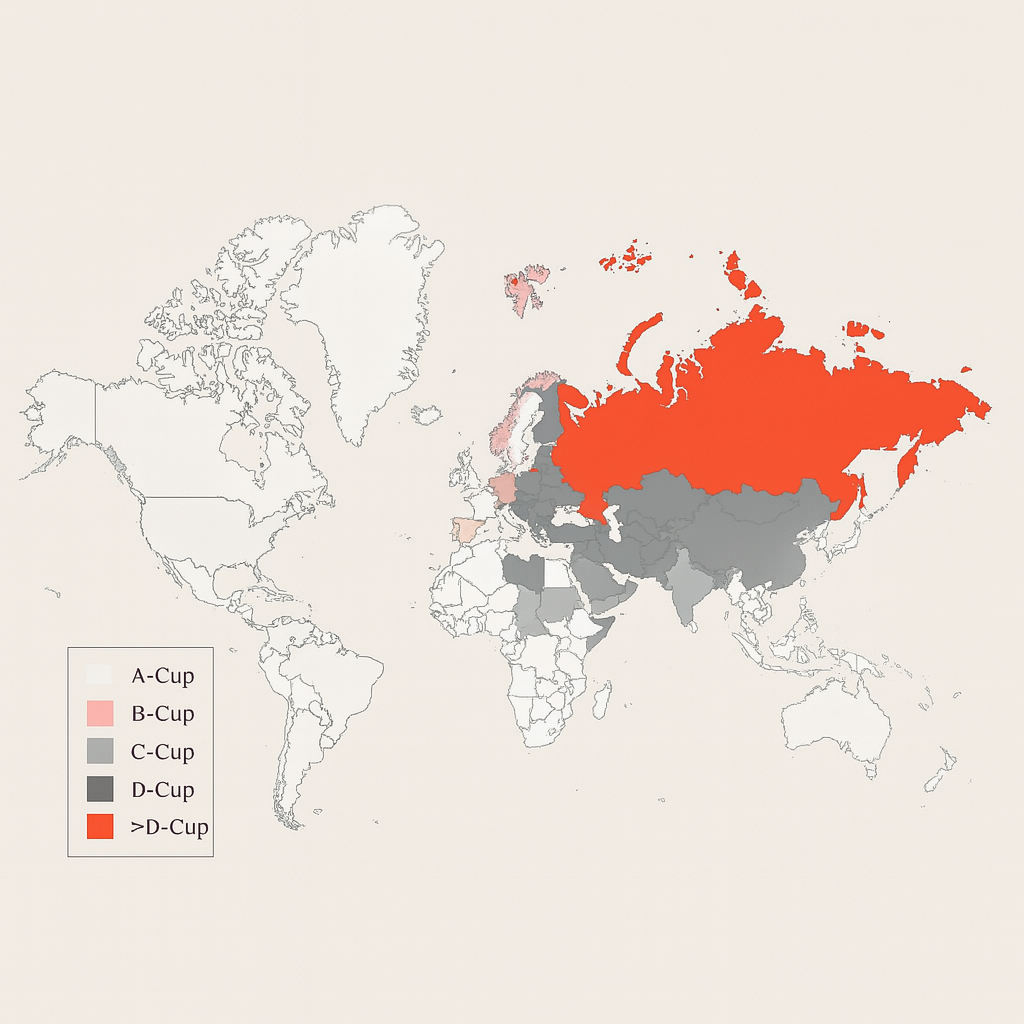 2. Dünyada Ortalama Meme Büyüklüğü Haritası Dünya genelinde meme dokusunun hacmi ve şekli, nüfusun genetik kökeni, beslenme düzeyi ve sosyo-kültürel faktörlere bağlı olarak büyük değişkenlik gösterir. Elimizdeki harita; ortalama göğüs çevresi ve meme altı çevresi ölçümlerinin analizi sonucunda oluşturulmuştur.