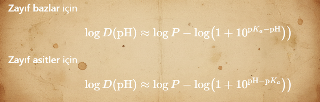 Log P nötr türün hidrofobikliğini verir. Bir bileşik su fazında iyonlaşabiliyorsa, belirli bir pH’daki dağılım katsayısı (D) daha anlamlıdır. Basit yaklaşımda (iyonların oktanole geçişi ihmal edilirse):