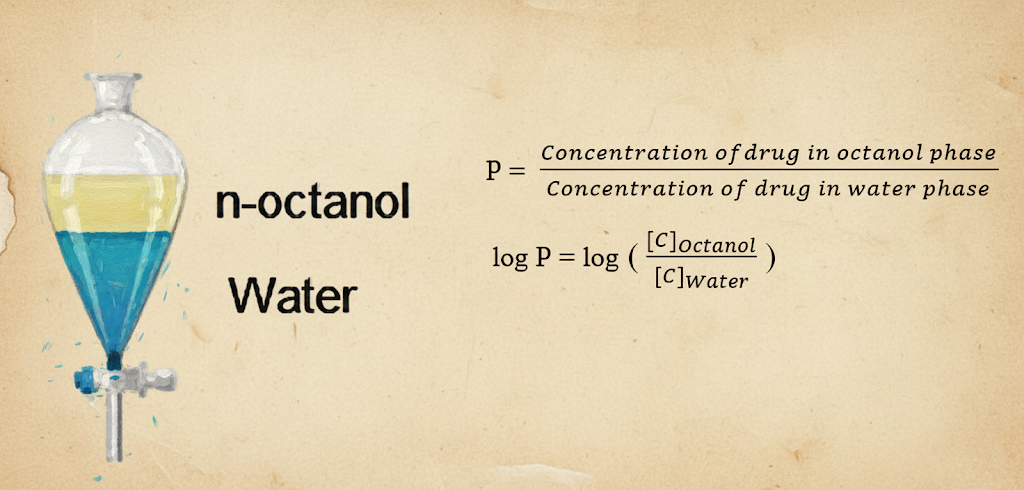 Burada konsantrasyonlar, iki fazın birbiriyle dengede olduğu koşullarda ölçülür. Log P (çoğu zaman (K_{\mathrm{ow}}) olarak da yazılır), yalnızca nötr (yüksüz) tür için tanımlanmış hidrofobiklik/lipofiliklik ölçütüdür; iyonlaşabilir bileşikler için pH’a bağlı log D kavramı kullanılır.