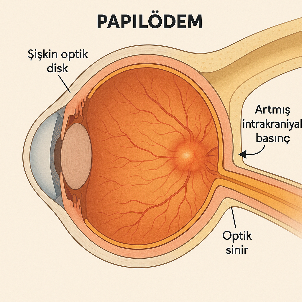 - Papil ödemi, kafa içi basınç (intrakraniyal basınç) artışı nedeniyle optik sinir başında (papilla) gelişen ödem ve kabarıklıktır. İntrakraniyal hipertansiyona bağlı olduğu için, papil ödemi terimi diğer optik disk ödemi sebeplerinden (ör. optik nörit) ayrılır ve genellikle iki taraflı görülür (asimetrik olabilir, nadiren tek gözle sınırlı kalır). Papil ödemi, özellikle beyin tümörü, menenjit veya idiopatik intrakraniyal hipertansiyon gibi ciddi durumların habercisi olabilen önemli bir klinik bulgudur.
