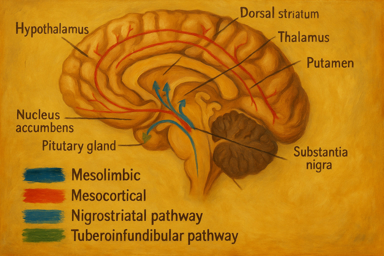 Diğer yandan dopamin fazlalığı veya dopaminerjik aktivitenin aşırı olması da sorunludur. Şizofreni ve benzeri psikotik bozukluklarda, özellikle mezolimbik yolakta dopaminin aşırı sinyalleme yaptığı düşünülmektedir; bu da hezeyan, halüsinasyon gibi pozitif semptomlara yol açabilir. Nitekim birçok antipsikotik ilacın, dopamin antagonisti olarak D₂ reseptörlerini bloke etmesi ve dopamin etkisini azaltması, bu hastalık belirtilerini hafifletmektedir. Aynı şekilde, dopaminin aşırı salınımı ve ödül mekanizmasının kontrolsüz çalışması, madde bağımlılığı ve tıkanırcasına yeme gibi dürtüsel davranış bozukluklarının gelişiminde rol oynar.
