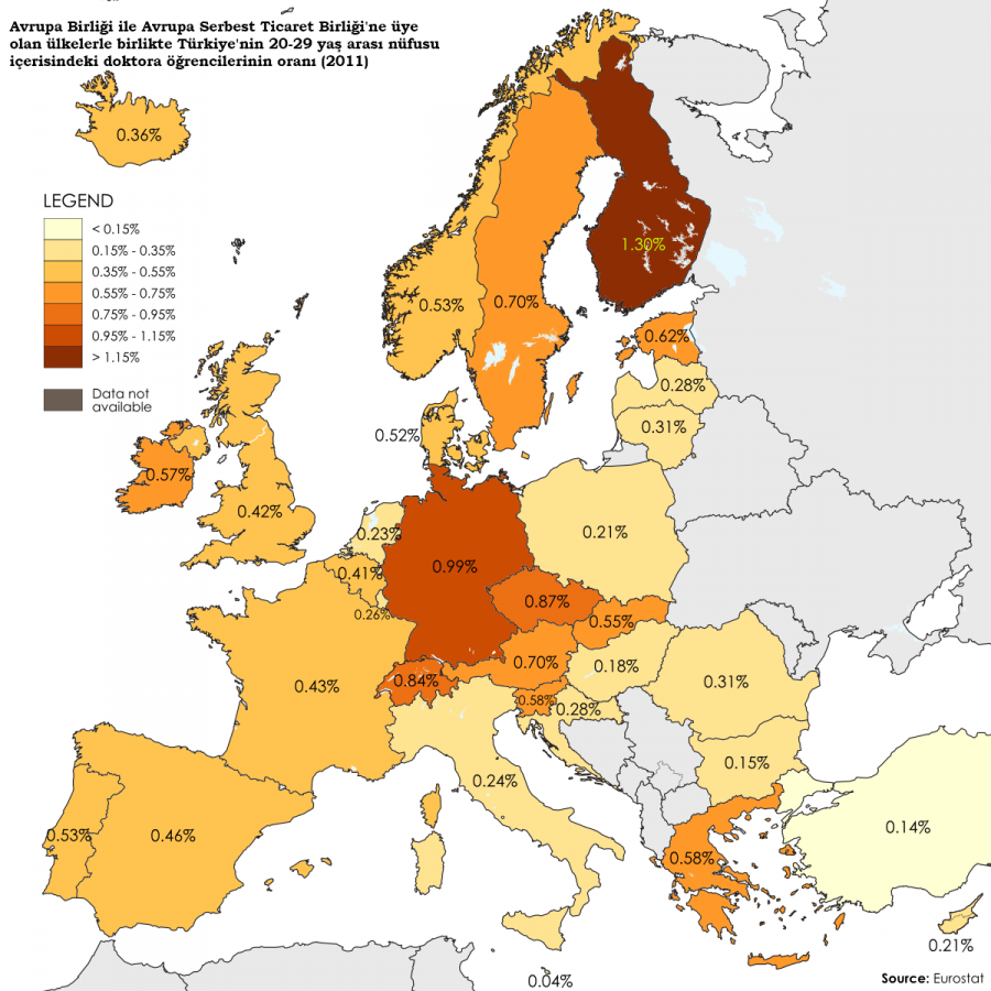 Haritada, Avrupa Birliği ile Avrupa Serbest Ticaret Birliği’ne üye olan ülkelerle birlikte Türkiye’nin de 20-29 yaş arası nüfusu içerisindeki doktora öğrencilerinin oranı gösteriliyor. Bilimin ve teknolojinin itici gücü olan doktora öğrencilerinin oranı, bir ülkenin bilime ne kadar ağırlık verdiğini ve bilimsel araştırmaları teşvik ettiğinin de tek olmayan ama faydalı olan ölçütlerinden birisi…