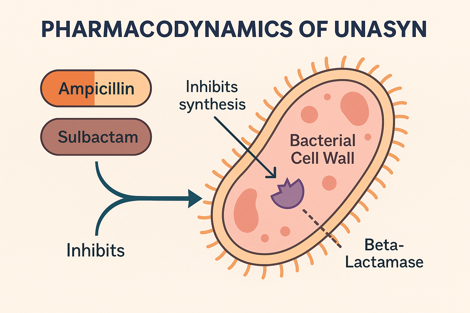 Unasyn, ampisilin ve sulbaktam etkin maddelerini sabit oranlarda içeren kombine bir antibiyotiktir. Ampisilin, yarı sentetik bir aminopenisilin türevidir; geniş spektrumlu bir beta-laktam antibiyotik olarak çeşitli Gram pozitif (ör. Streptococcus pneumoniae, Enterococcus faecalis) ve bazı Gram negatif bakterilere (ör. Haemophilus influenzae, Escherichia coli vb.) karşı etkilidir. Ancak ampisilin, beta-laktamaz üreten bakterilere karşı tek başına etkinliğini yitirir çünkü bu enzimler beta-laktam halkasını hidrolize ederek ilacı inaktive eder. Sulbaktam ise penisilinin yapısal analoglarından bir beta-laktamaz inhibitörüdür; tek başına belirgin antibakteriyel aktivitesi yoktur (sadece Neisseria ve Acinetobacter gibi sınırlı bazı türlere karşı zayıf etkilidir). Sulbaktam, pek çok bakteride direnç mekanizması olan beta-laktamaz enzimlerine geri dönüşümsüz biçimde bağlanarak onları inhibe eder ve böylece ampisilinin bu enzimler tarafından parçalanmasını engeller. Ampisilin+sulbaktam kombinasyonu (Unasyn), genellikle 2:1 oranında formüle edilmiştir (örneğin 1 g ampisilin + 0,5 g sulbaktam içeren flakonlar) ve intravenöz veya derin intramüsküler yolla uygulanmak üzere toz formda bulunur.