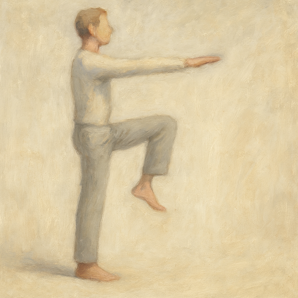 - Ayaklar kalça genişliğinde, dizler hafif fleksiyonda, kollar omuz seviyesinde öne uzatılmış (yaklaşık 90°), avuç içleri aşağı bakar.