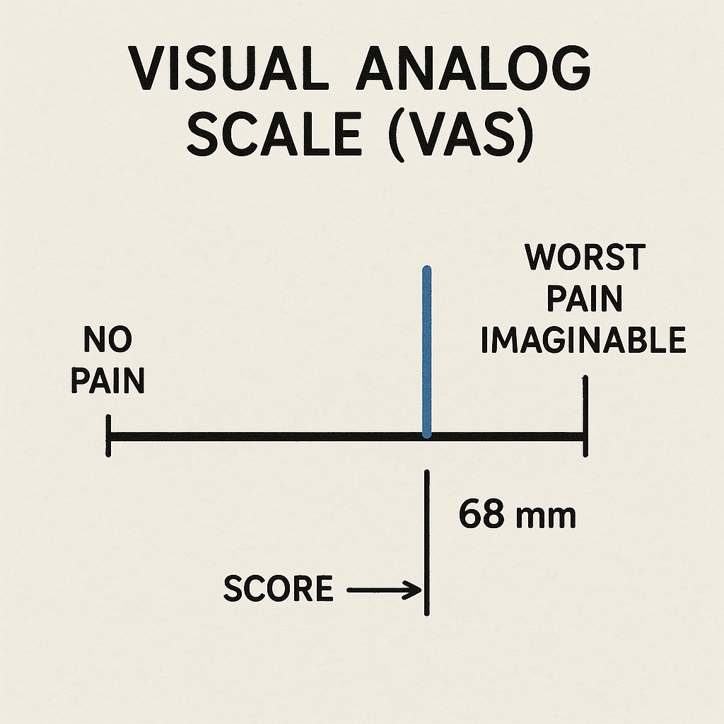 - Uygulama: Hastalar algıladıkları yoğunluğu çizgiye işaretler. Puan, sol uç noktadan işarete kadar olan mesafeyi (milimetre cinsinden) ölçerek belirlenir ve 0–100 mm aralığı elde edilir.